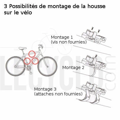 La housse peut se fixer sur votre vélo, soit au niveau du top tube, soit sur le cadre au niveau du tube de selle, ou bien sur le tube inférieur du cadre.