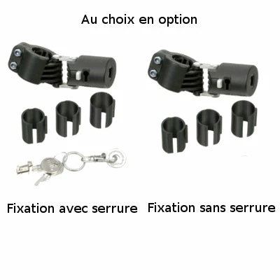 Cette remorque se fixe au vélo par la tige de selle. Pour cela, il vous faut la fixation pour remorque ANDERSEN, non fournie, en version sans serrure ou avec serrure pour sécuriser la remorque au vélo. Ce simple dispositif fixé sur la tige de votre selle est fiable et robuste.