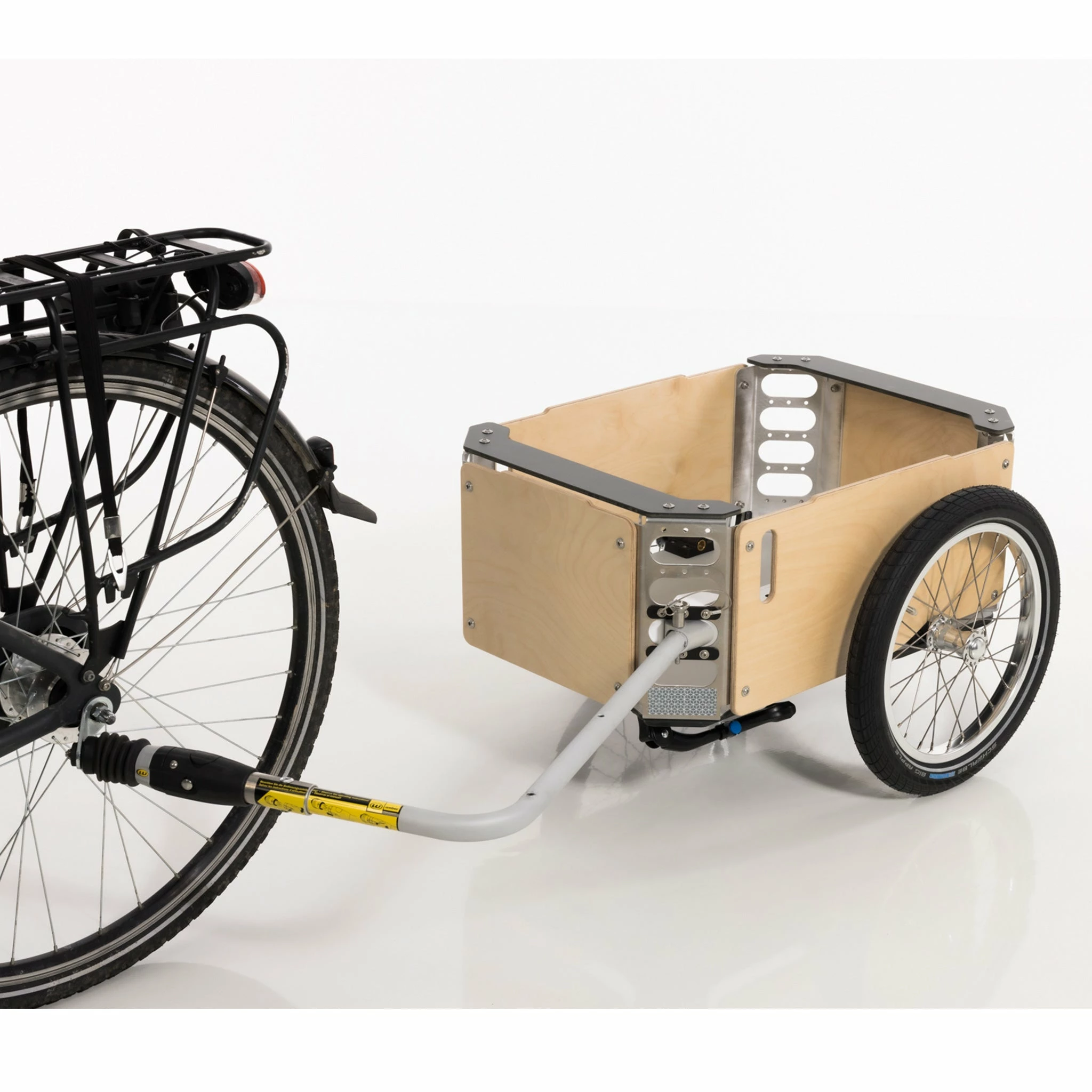 La remorque Aperta est la plus légère des remorques Carette. À ciel ouvert, elle se compose uniquement de la structure en bois vernis de 70 L et des amortisseurs intégrés. Vous pouvez la charger autant que vous le souhaitez jusqu’à 40 kilos. La Aperta ne demande que peu de maintenance et s’entretient très facilement. Les roues 16 pouces robustes Hinterher sont tout chemin, et les pneus 2.00 pouces sont assez larges pour assurer une bonne tenue sur rues pavées, chemins cahoteux et terrains sablonneux. La Aperta est ainsi parfaitement adaptée pour les déménagements à vélo, et autres transports de marchandise. Elle offre un roulage silencieux et stable, passe les portes et les ascenseurs et peut même monter quelques marches. La béquille réglable intégrée permet de maintenir la remorque à l’horizontal lors du chargement et du déchargement.