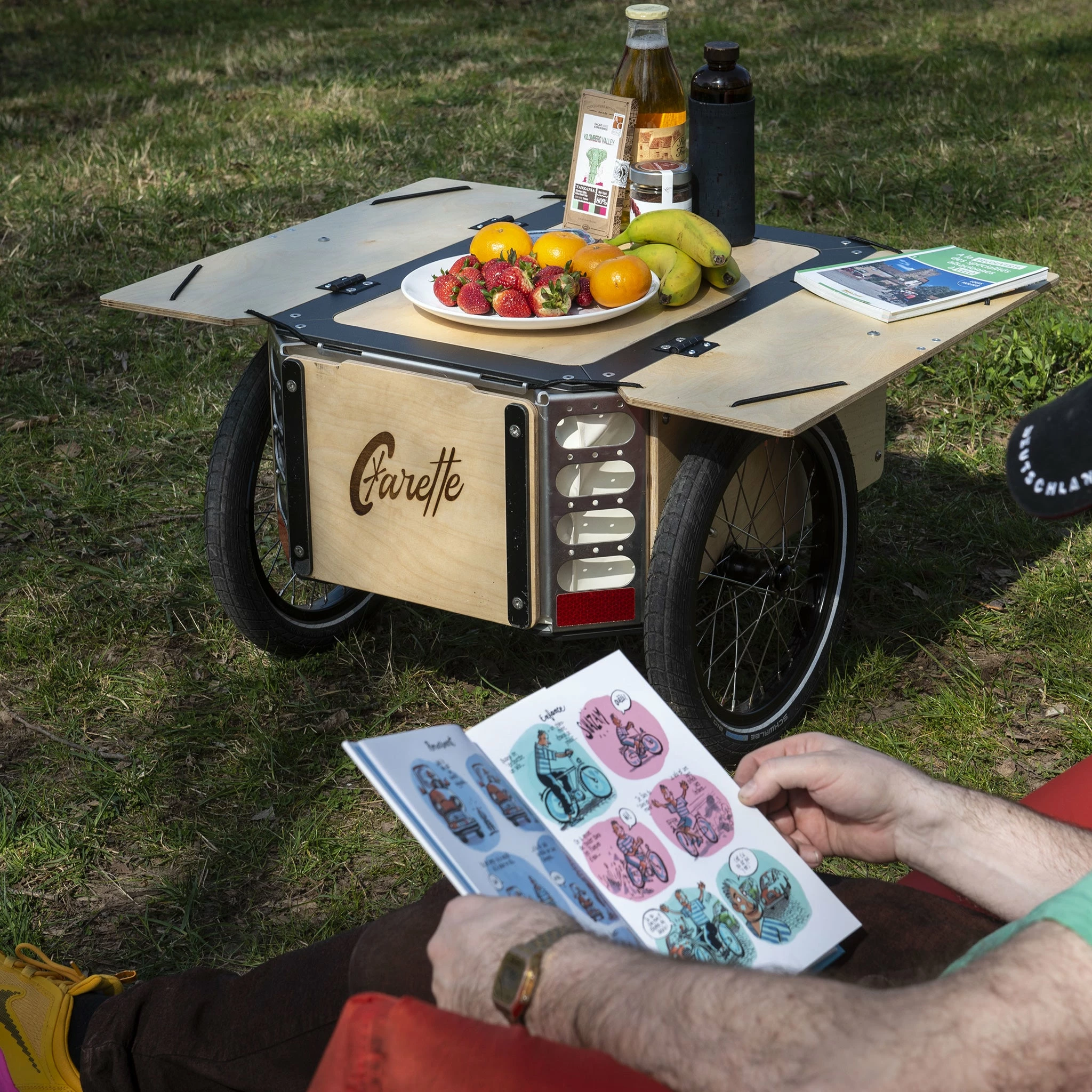 Découvrez la remorque Carette Arca 2306 modulable tantôt en coffre tantôt en table de pique-nique ou stand pour professionnels à vélo.